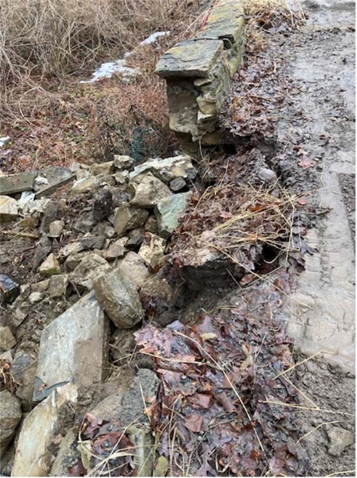 Both sides of the roadway are bordered by stone masonry parapets, architectural elements that not only provide protection for vehicles but also preserve the aesthetic character of the bridge. Damage to a portion of this parapet prompted county engineers to initiate emergency repair work in order to maintain the integrity of the structure.