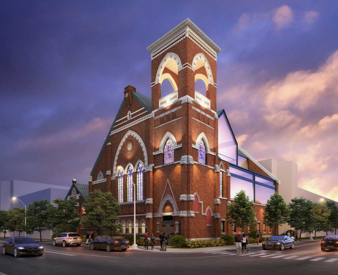 The design team is presenting updated renderings that incorporate additional masonry and restoration features intended to blend new construction with what remains of the original building. A centerpiece of the plan is the recreation of the church’s distinctive rose window, which was shattered in 1937 and later sealed with brick.