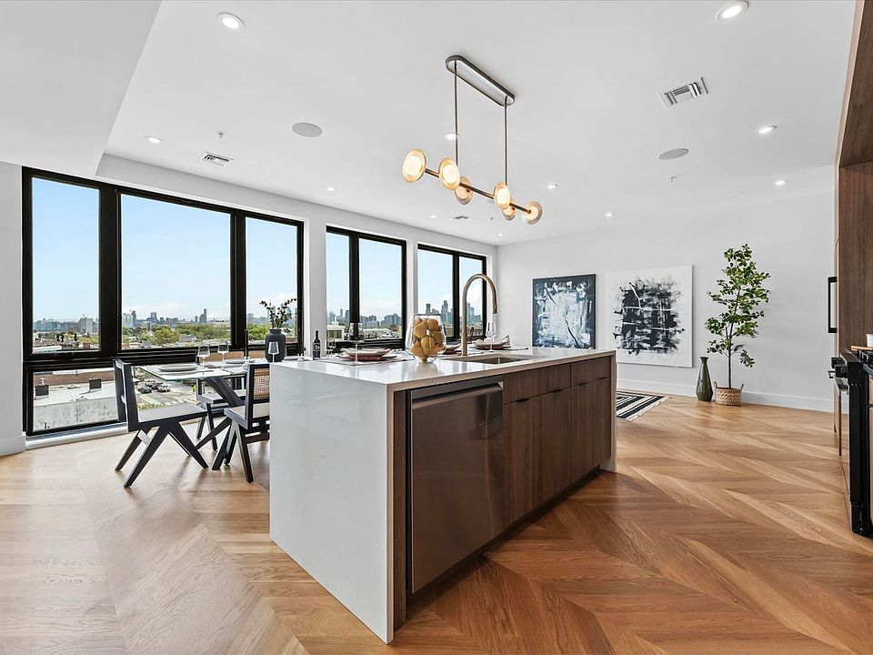 Inside the final two homes, Penthouse 4 and Penthouse 5 introduce a full-floor living experience that is increasingly difficult to find in new urban construction. Both residences feature open layouts framed by floor-to-ceiling windows, allowing natural light to flood every room while maximizing skyline visibility. White oak chevron flooring runs throughout the homes, anchoring the interiors in understated elegance and craftsmanship.
